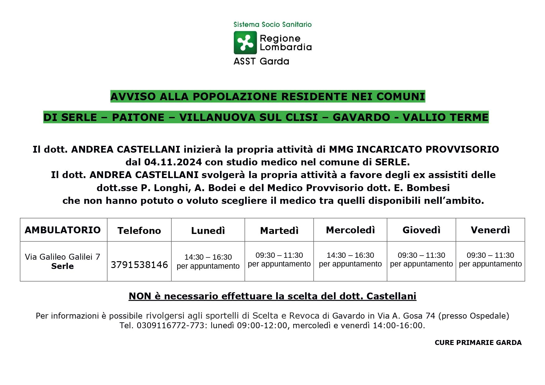 Il dott. Andrea Castellani inizierà la sua attività di Medico di Medicina Generale (MMG). Con incarico provvisorio dal 4 novembre 2024 a Serle, presso lo studio di via Galileo Galilei 7. Si occuperà degli ex assistiti delle dott.sse P. Longhi, A. Bodei e del dott. E. Bombesi.