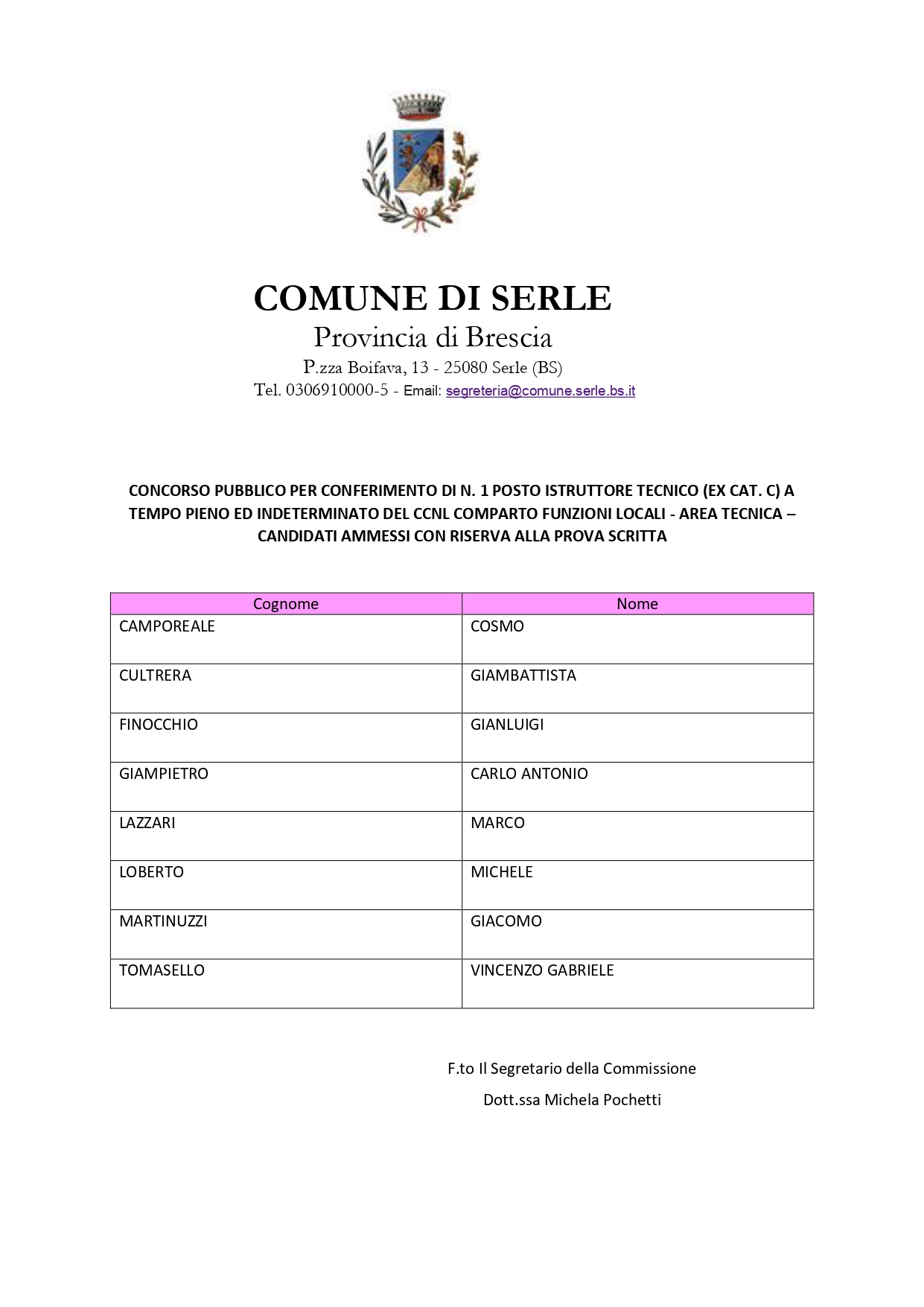 CONCORSO PUBBLICO PER CONFERIMENTO DI N. 1 POSTO ISTRUTTORE TECNICO (EX CAT. C) A TEMPO PIENO ED INDETERMINATO DEL CCNL COMPARTO FUNZIONI LOCALI - AREA TECNICA – CANDIDATI AMMESSI CON RISERVA ALLA PROVA SCRITTA