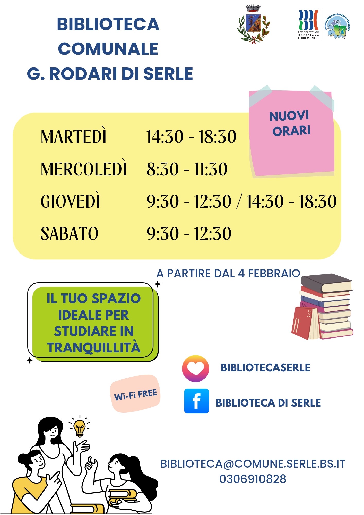 Si pubblicano gli orari della bibiolteca comunale Gianni Rodari di Serle, in vigore dal 04/02/2025